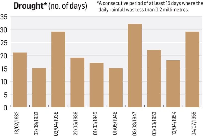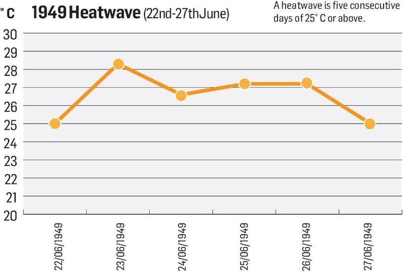In the period modelled to date, the CSO found that the only heatwave – five consecutive days of 25 degrees or over – occurred in June, 1949 when temperatures reached a high of 83 degrees Fahrenheit (28.3C). That heat wave was far more humid than the one this summer.