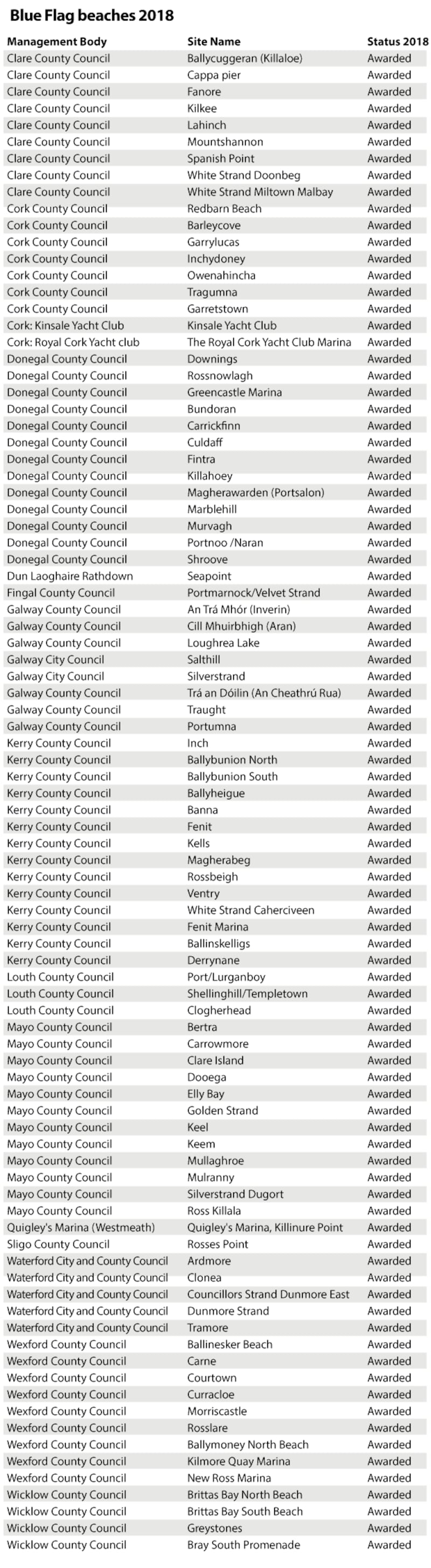 All beaches and marinas awarded in 2017 retained blue flag status for 2018. Killiney and Donabate beaches in Co Dublin lost their blue flags in 2017 and did not regain them in 2018 due to their current bathing water classification by the EPA.