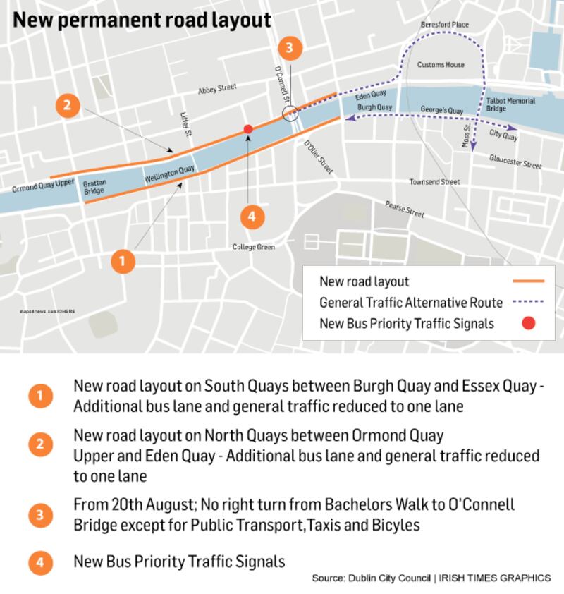 Cars are banned from turning right from Bachelors Walk onto O’Connell Bridge, and general traffic will be reduced to one lane from Ormond Quay to Eden Quay on the northside and from Burgh Quay to Essex Quay on the south side, to create additional bus lanes.