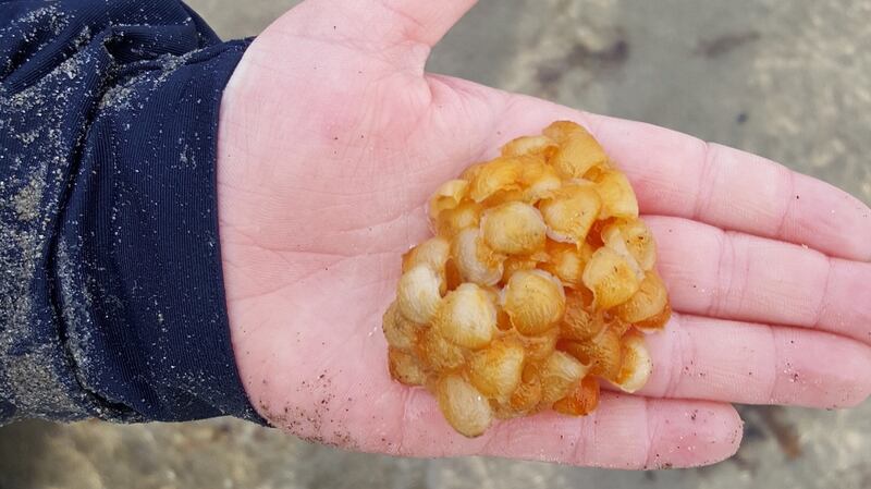 We found this object at Bertra Beach when the tide was out. It looks like the hatched eggs of something.