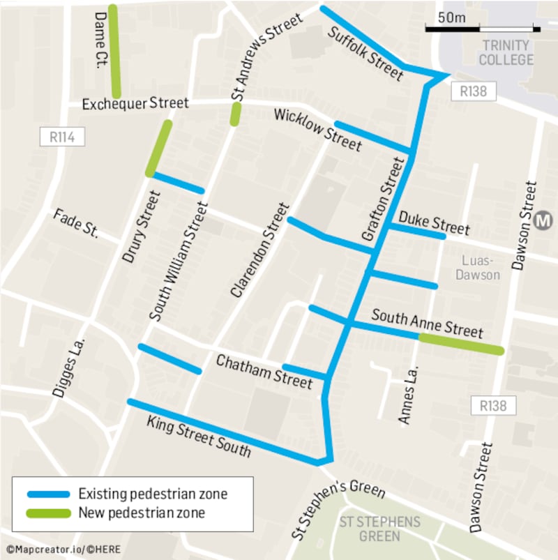 Cars are set to be permanently banned from several areas around Grafton Street in Dublin following successful pedestrianisation and outdoor seating trials during the summer.