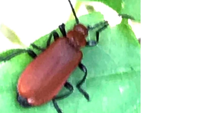 It is the red-headed cardinal beetle. Rosalie Prendergast also sent a photo of one which she feared was feeding on her wisteria. Cardinal beetles sun themselves on plants but breed in the bark of trees and are carnivorous.