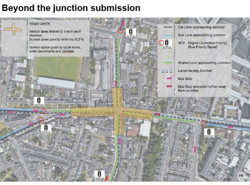 The group proposes removing one of the four traffic lanes to create space for cycle lanes, wider footpaths, “parklets” – small seating areas – and loading bays. This would require cars approaching the Doyle’s Corner crossroads to share the bus lane, but buses would be given priority at the traffic lights to allow them to travel through the junction first.