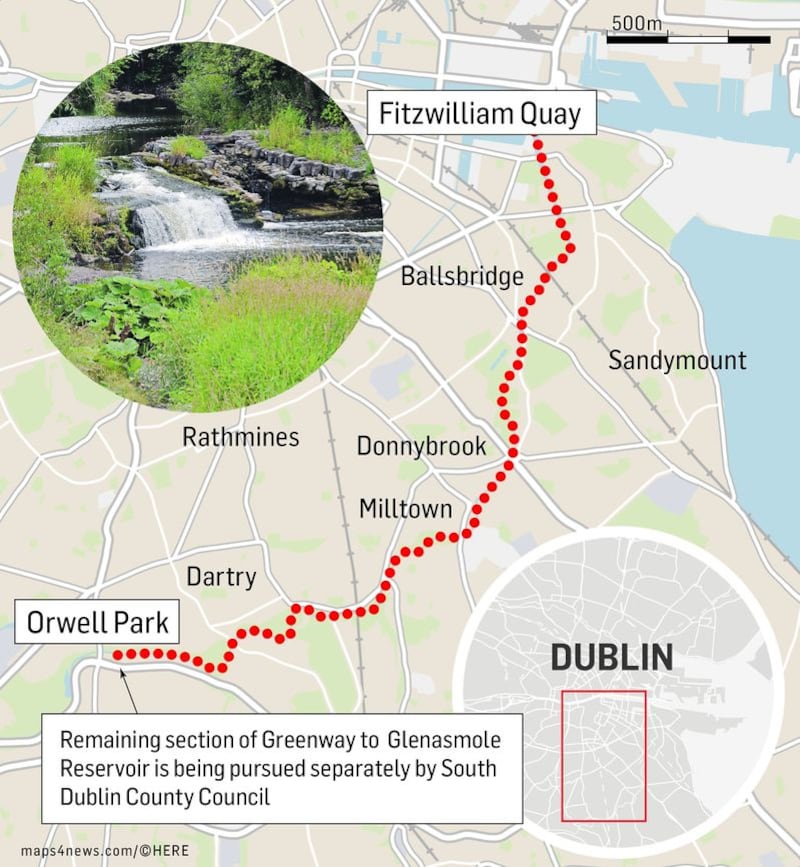 The greenway, which is expected to cost in the region of €22 million, passes through three local authority areas: Dublin city, Dún Laoghaire-Rathdown and South Dublin. The city council will develop the route from the docks to Orwell park in Dartry, which includes a section of Dún Laoghaire-Rathdown lands, while South Dublin County Council will pursue the remaining 14km to the mountains.