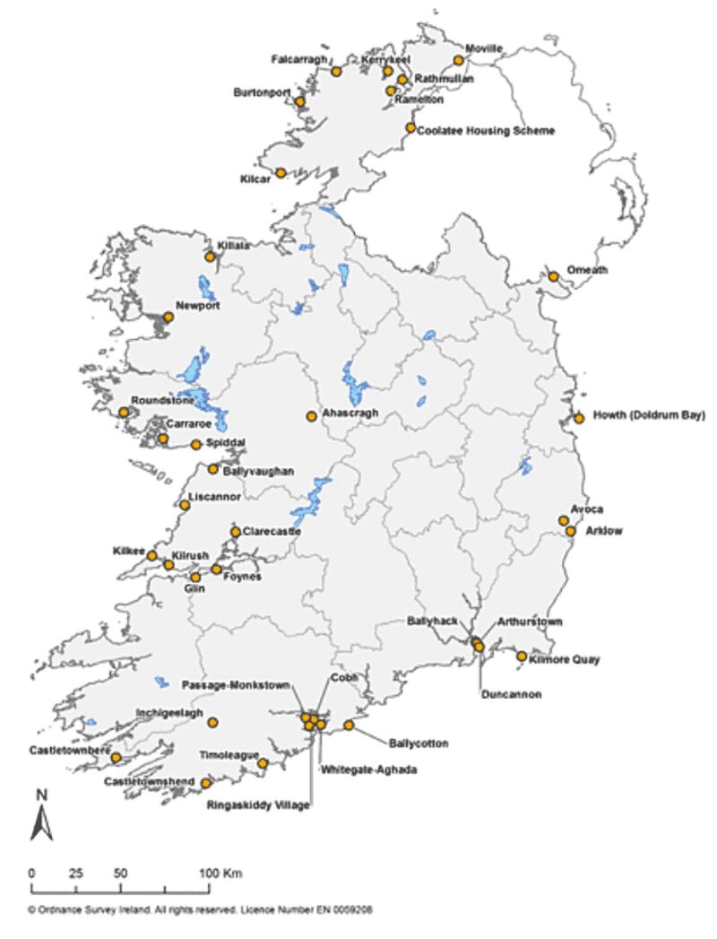 The 38 locations where raw sewage is being discharged into the local environment are: Howth (Doldrum Bay) in Co Dublin; Castletownbere; Inchigeelagh, Castletownshend, Timoleague, Ringaskiddy village, Whitegate-Aghada, Passage-Monkstown, Cobh, and Ballycotton in Co Cork; Ballyhack, Duncannon, Arthurstown and Kilmore Quay in Co Wexford; Avoca and Arklow in Co Wicklow; Glin and Foynes in Co Limerick; Clarecastle, Kilrush, Kilkee, Liscannor and Ballyvaughan in Co Clare; Spiddal, Carraroe, Roundstone and Ahascragh in Co Galway; Newport and Killala in Co Mayo; Kilcar, Burtonport, Falcarragh, Kerrykeel, Rathmullan, Ramelton, Moville and Coolatee Housing Scheme in Co Donegal; and Omeath in Co Louth.