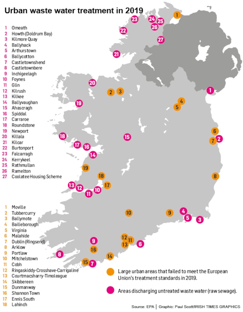 In all, 33 places are unlikely to receive treatment until an undetermined date after 2021, it warns – including Arklow and Cobh, which have a combined population of 32,000.