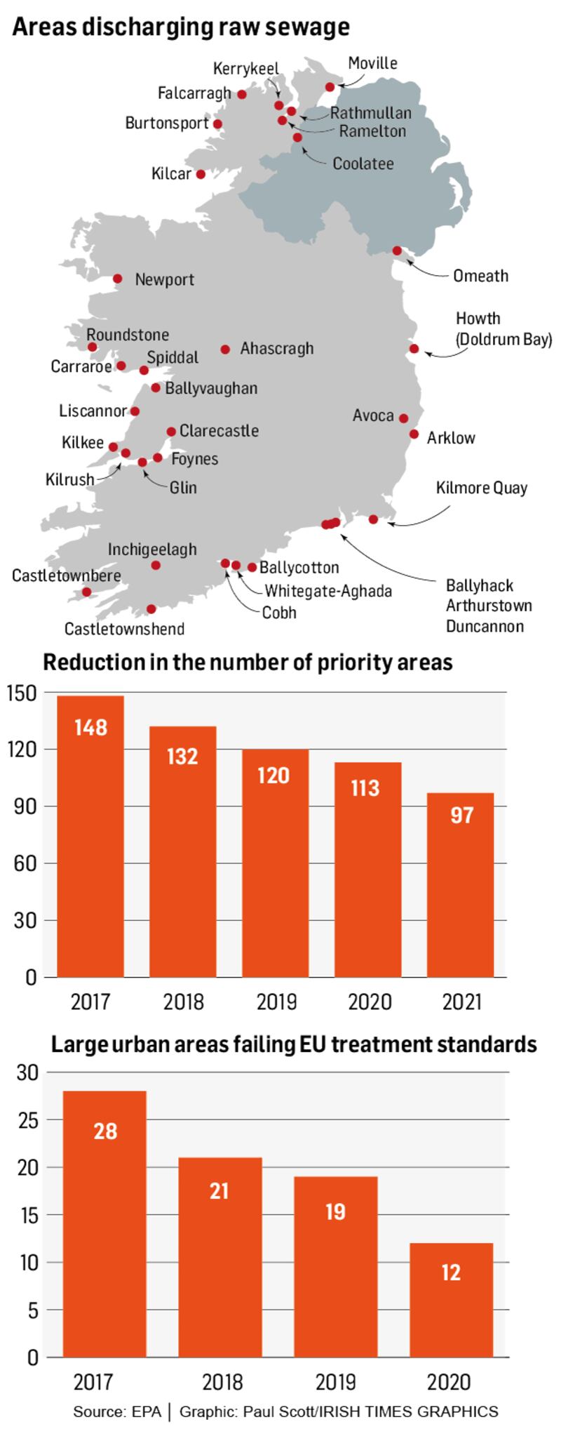 Some progress is acknowledged. Last year saw a reduction from 19 to 12 large towns failing to comply with EU standards and the discharge of raw sewage from Killala, Co Mayo, ended thanks to a new treatment plant. The number of larger urban areas falling short of standards is down from 28 in 2017 to 12 in 2020.