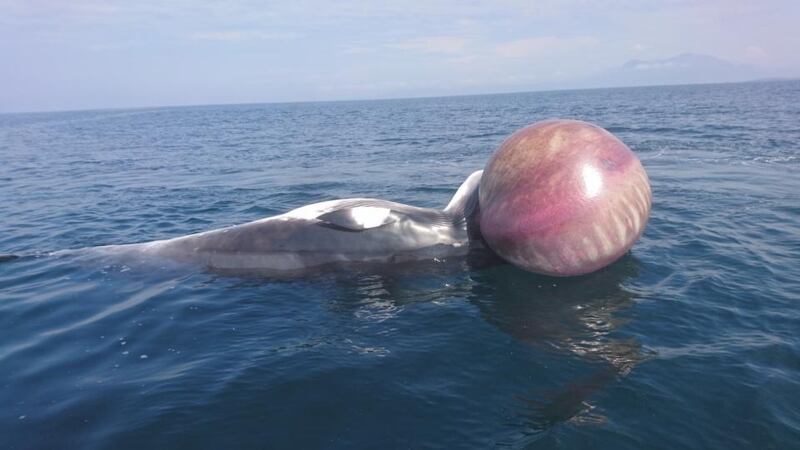 I spotted this sad sight about two miles off Renvyle, Co Galway. I thought it was a buoy that entangled the creature, but up close it appears to be part of it – a swim bladder or part of the gut. – Páid Ó Donnchú, Na Forbacha, Co na Gaillimhe