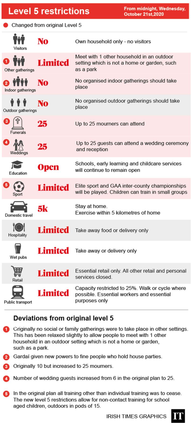 Government sources in Dublin have also indicated that while a review of the Covid-19 situation in mid-November could result in the 5km travel restriction imposed under current Level 5 measures being expanded to 10km, it is more likely the current full set of restrictions would remain in place for six weeks as planned with the aim of putting the whole country at Level 2 in December.