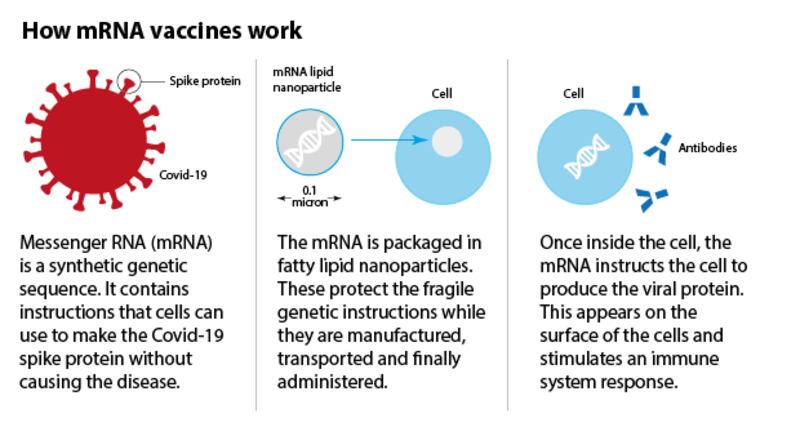 mRNA: This uses genetic material known as mRNA; the genetic code inside the coronavirus responsible for its spike protein is identified.