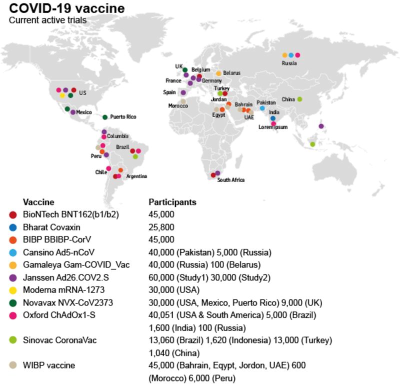 Twelve vaccines are in Phase 3 trials, each conducted on up to 60,000 people. Six from China and Russia are approved for early/limited use but without final Phase 3 results.