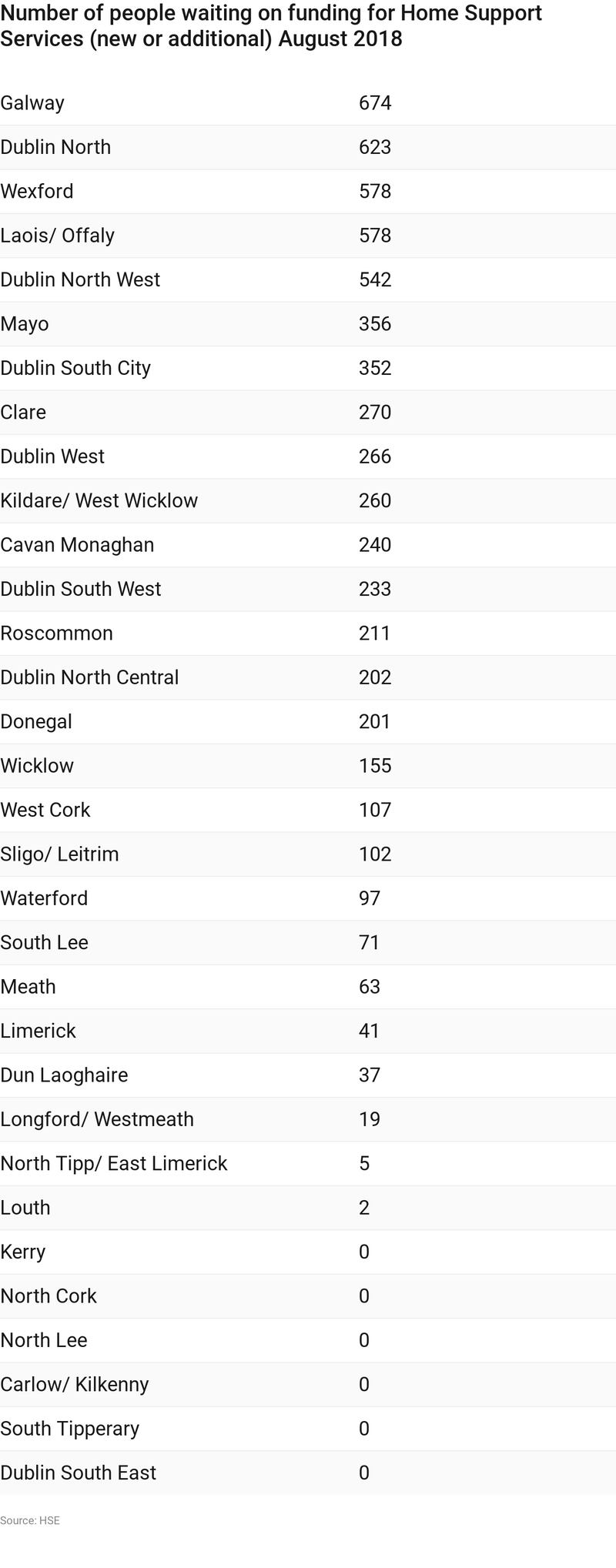 Galway has the longest waiting list for home support services, with 674 people on the list last August, according to the figures from the Health Service Executive. Dublin North recorded 623 people on the waiting list and Wexford and Laois/Offaly each had 578 on their lists.