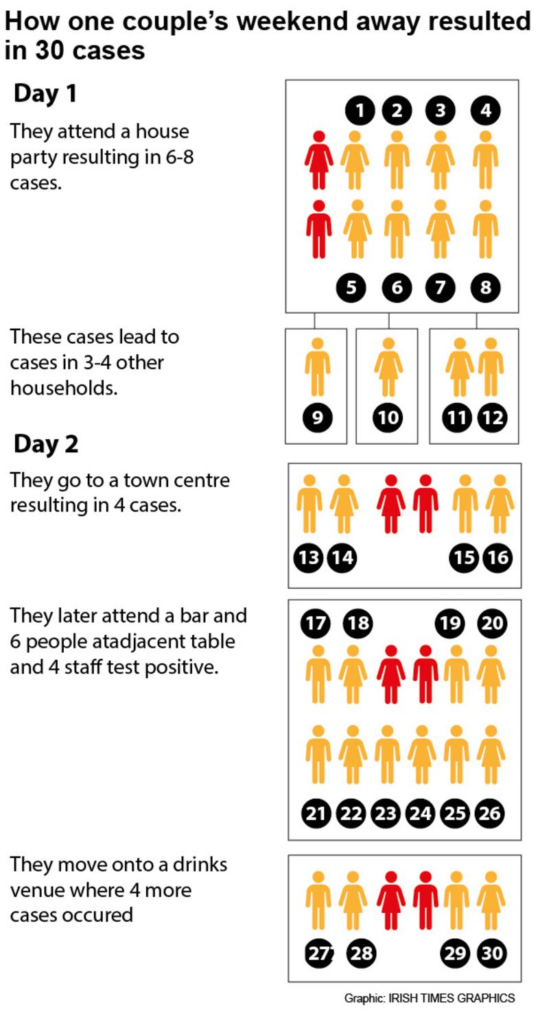 Dr Breda Smyth of Director of Public Health at HSE West cited a cluster of 30 cases which arose after a young couple went away for a weekend and attended a house party. This resulted in six to eight cases, and cases in three to four households. On the second day of their trip, they went with friends to a town centre, resulting in four more cases.