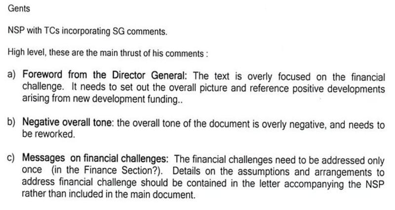 “The financial challenges need to be addressed only once (in the financial section?). Details on the assumptions and arrangements to address financial challenge should be contained in the letter accompanying the NSP [national service plan] rather than included in the main document,” the same note added.