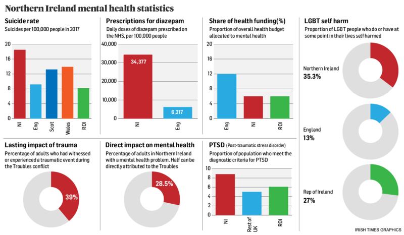 The region also continues to have the highest suicide rate in the UK or Ireland, with about 18 suicides per 100,000 people in the population compared with nine suicides in England or eight in the Republic of Ireland, according to official government figures.