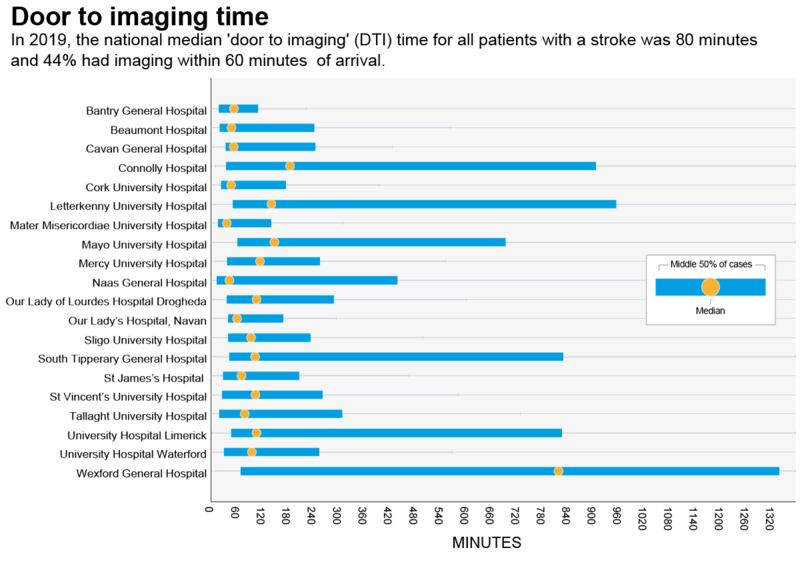 Stroke patients are supposed to be scanned within an hour of arriving in hospital, but in 14 out of 20 hospitals this target was not reached. In Wexford General Hospital, the average “door to imaging” time was almost 14 hours, compared with one hour and 20 minutes across all hospitals.