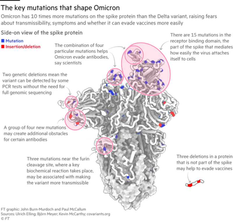 Omicron, first detected in southern Africa, possesses an unprecedented 50 mutations, more than half of which are on the spike protein that allows the virus to bind to human cells.