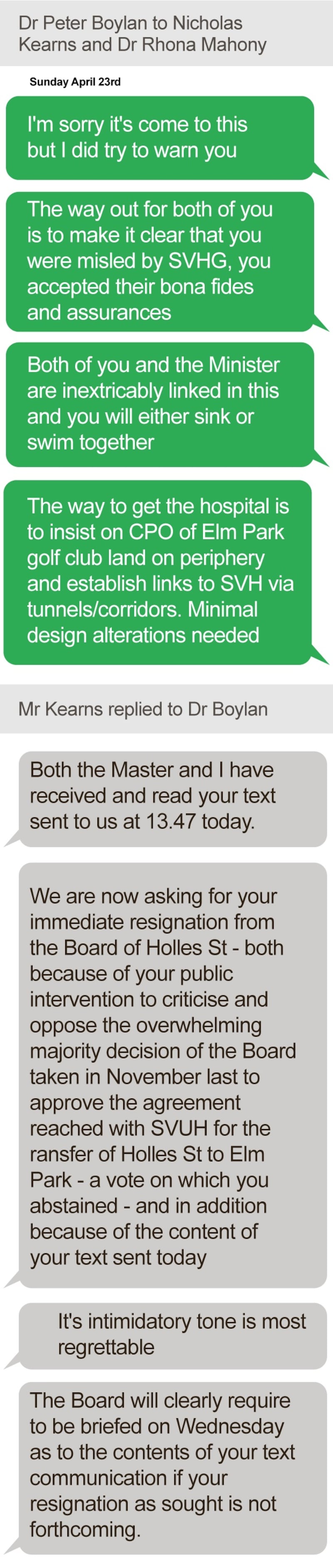 Dr Boylan had initiated the exchange with a text message to both Mr Kearns and current master, Dr Rhona Mahony, who is Dr Boylan's sister-in-law, in which he urged them to "sit down and talk".
