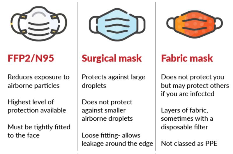 Fabric masks or face coverings such as homemade varieties do not protect you but may protect others if you are infected. They are not classed as official personal protective equipment.