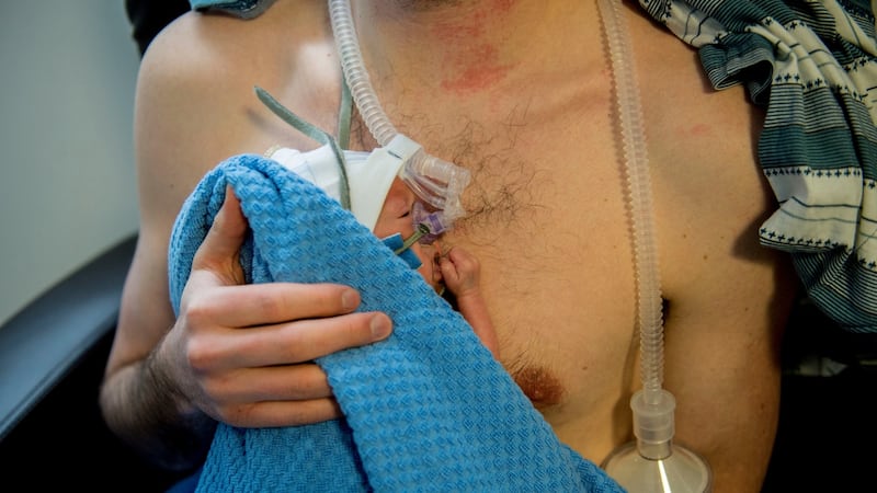 Baby Con is not a storm baby having been born 15 weeks prematurely eight weeks ago, but storm conditions forced his parents Jill Barrett and Dáire O'Neill to walk in from Stoneybatter, Dublin to spend the day with their baby as the hospital does not have accommodation for relatives.