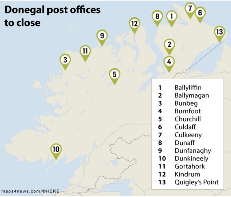 Separately on Friday, Conradh na Gaeilge held a demonstration outside the GPO in Dublin to protest against the closures. Dr Niall Comer, president of the organisation which promotes the Irish language, said An Post must ensure that the current redundancy process being implemented by it would not mean that post offices in Gaeltacht areas would be closed.