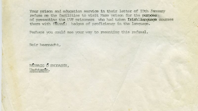 But perhaps among the more surprising items for some will be an exchange of letters between then president of Conradh na Gaeilge Pádraig Ó Snodaigh and the Northern Ireland Office (NIO) in May 1978 over a request to meet in person UVF prisoners at the Maze prison. Mr Ó Snodaigh had been denied permission by prison authorities to present loyalist prisoners with an Fáinne Gaelach – a badge representing ability in the Irish language.