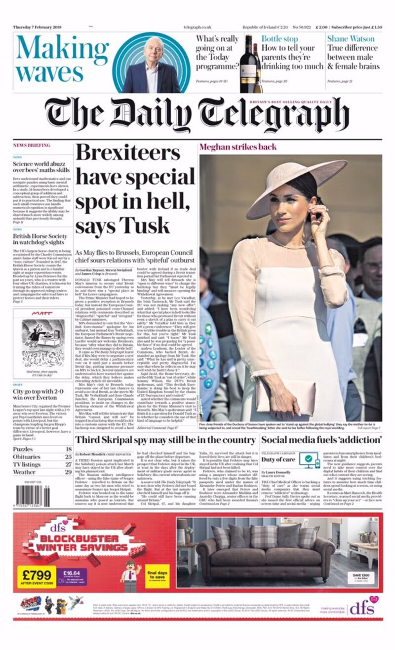 The Daily Telegraph: Brexiteers have special spot in hell, says Tusk (paywall)