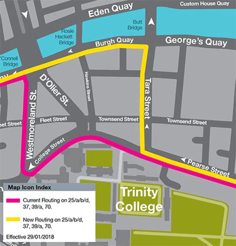 The 25, 25a, 25b, 25d, 37, 39, 39a and 70 currently go up College Street and around Westmoreland Street from Pearse Street but will be re-routed through Tara Street and Burgh Quay and will return back on to their normal routes at Aston Quay.