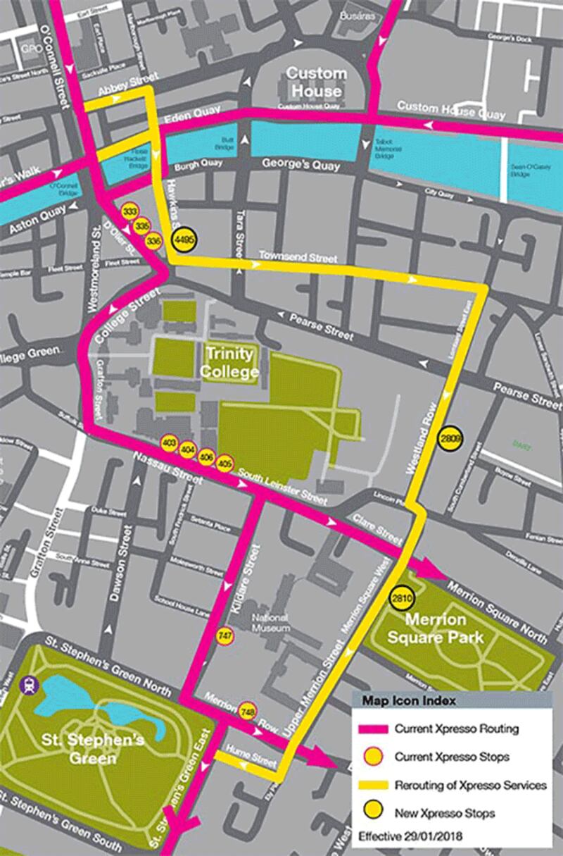 However, Xpresso routes 25x, 27x, 32x, 33x, 39x, 41x, 51x, 66x and 67x, which only operate at rush hour, will no longer serve stops on D’Olier Street, Nassau Street, Kildare Street and Merrion Row.