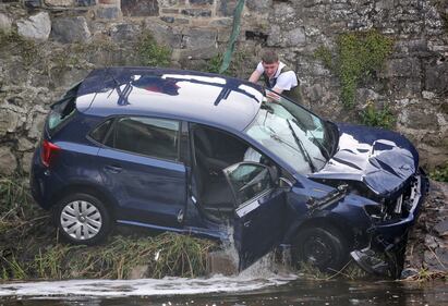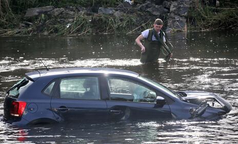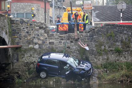 Two cars crashed into the river at Celbridge Bridge, Co Kildare after leaving the scene of a robbery in Lucan