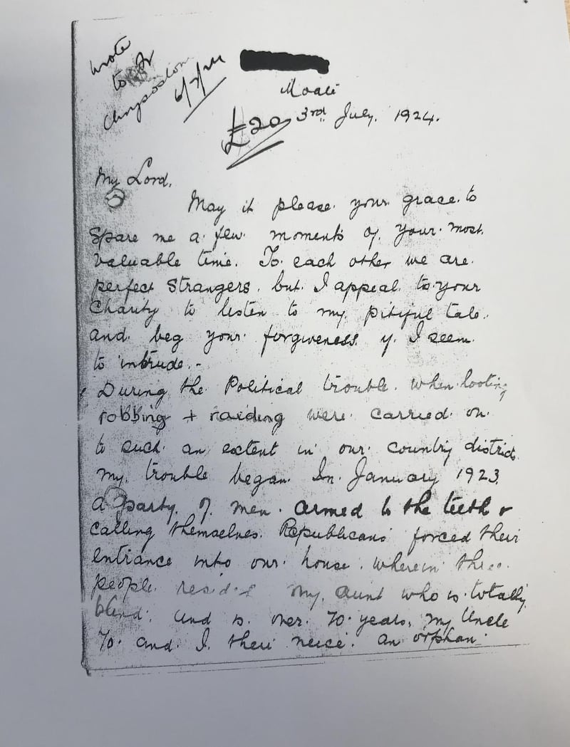 In the letter sent in July 1924, she recalled:“During the political trouble when looting and robbing and raiding were carried on to such an extent in our country district, my trouble began.