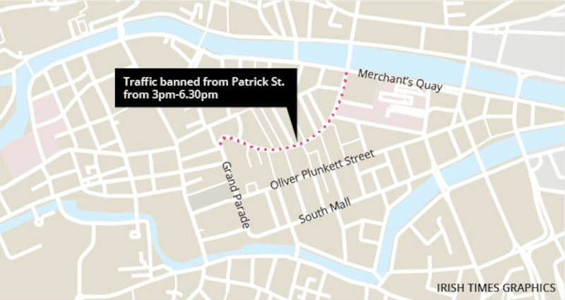 Traffic approaching Patrick Street from Grand Parade will be diverted via Daunt Square and Cornmarket Street towards the quays, while there will be no access to Patrick’s Street from Academy Street.