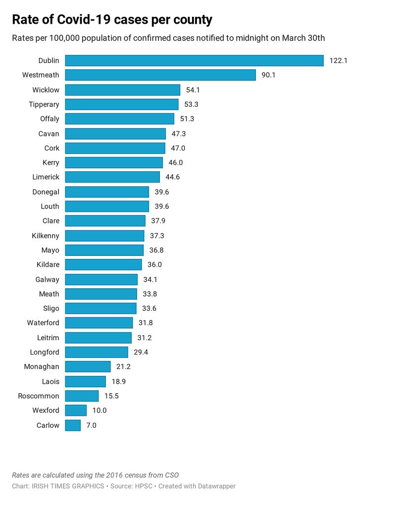 This Irish Times analysis of the HPSC’s figures is based on the latest breakdown of data by county made available of 2,990 confirmed cases as of midnight, March 30th.