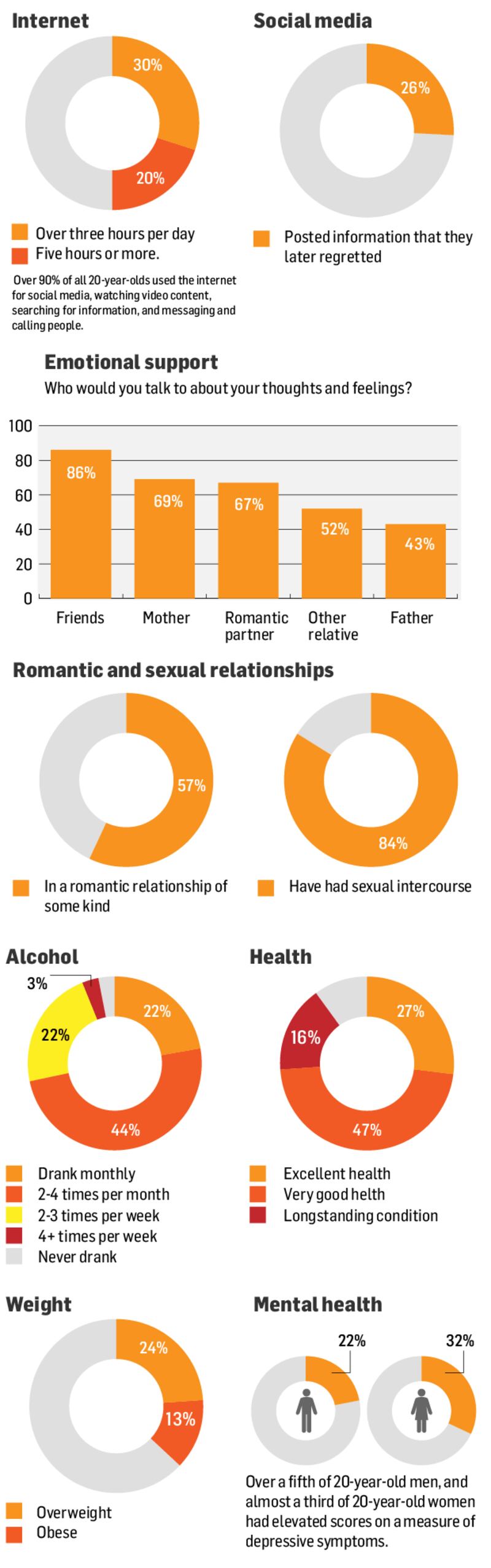 Many 20-year-olds appeared fairly satisfied with their lives; however, substantial minorities were experiencing at least some level of distress, including a quarter who reported above-normal levels of stress and a fifth who had elevated scores on a measure of depressive symptoms.