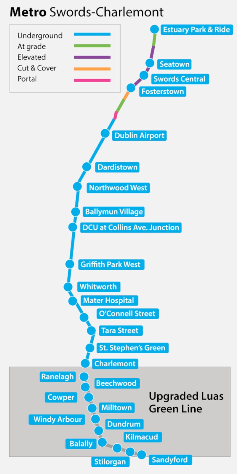 An elevated line will run along the Swords bypass before the subterranean element stretches from before Dublin Airport to Charlemont. The existing Luas green line will be upgraded to an overground Metro line between Charlemont and Sandyford. This upgrade, at a cost of €500 million, is being justified by the need for greater capacity on the line in the years ahead.
