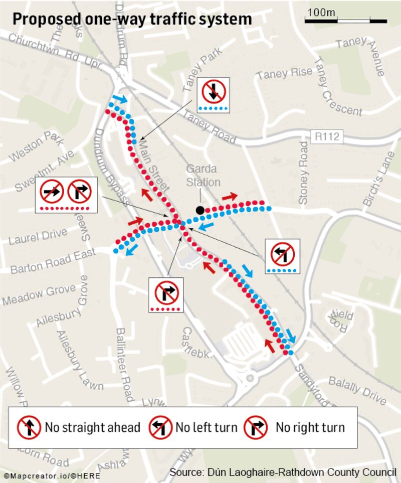 The one-way traffic lane will run from Sandyford Road northwards onto Main Street, as far as the entrance to the Lidl car park.