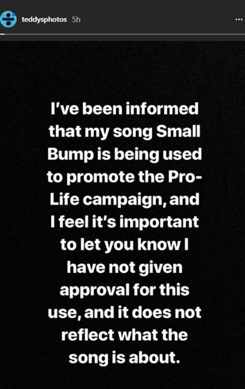 The singer-songwriter distanced himself from those using Small Bump to promote the anti-abortion cause, saying "it does not reflect what the song is about" in a post to his story on Instagram.