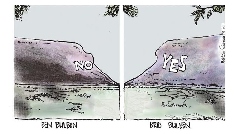 The erection of the sign prompted a number of people to create mock images online and in print, proposing alternative messages for the mountainside. Artist Fuchsia MacAree used the “No” to turn Ben Bulben into a “volcano”, while Yes advocate Darren Purcell transformed the slogan to read “No advice from me I’m a mountain”.