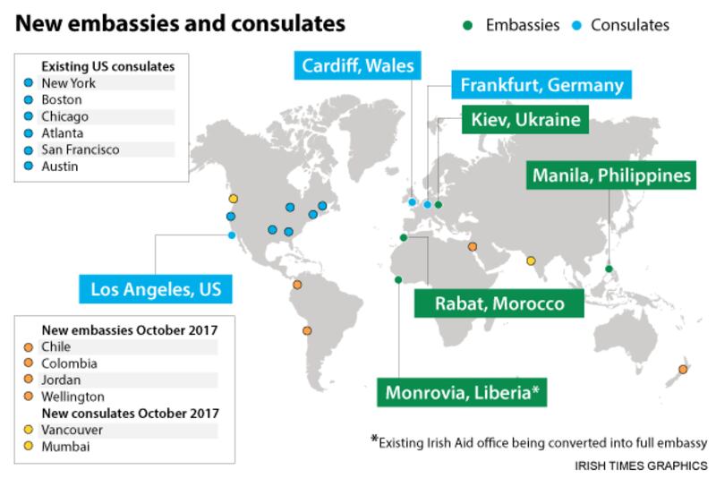 The overseas expansion fulfils a proposal made by Mr Varadkar made during last year's Fine Gael leadership election and follows last October's announcement of new embassies in New Zealand, Colombia, Chile and Jordan and new consulates in Vancouver and Mumbai.
