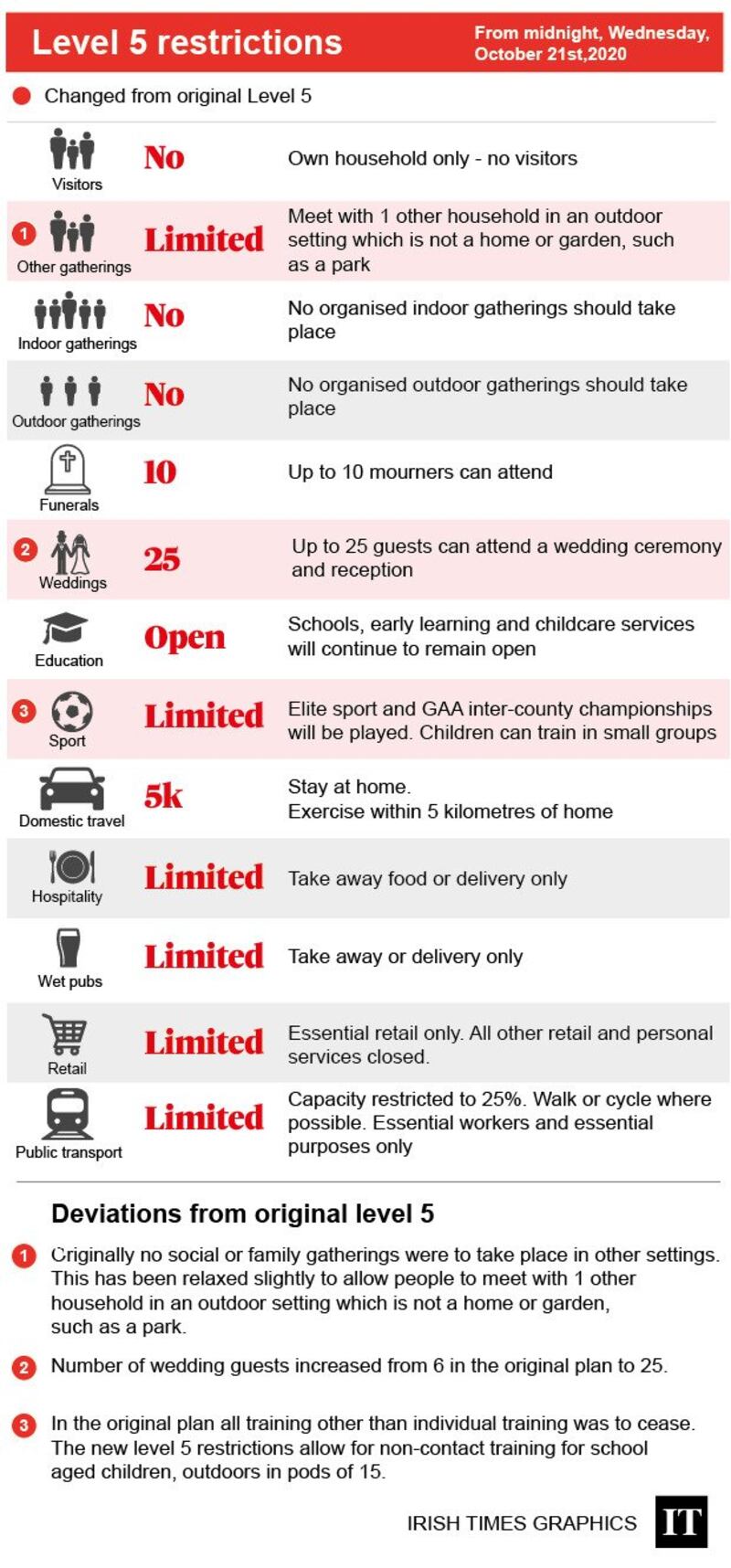 He said the Level 5 restrictions had to “include instruments to reduce congregation of people, reduce gatherings of people in shops and in other locations” in an effort to bring down the number of people infected with the virus.