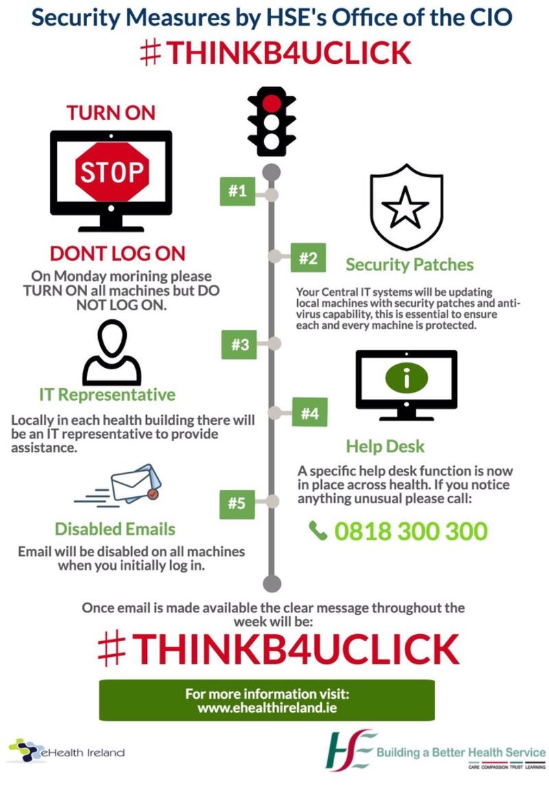 All Health Service Executive staff are being asked to switch on computers on Monday morning but not to log on, in the wake of the global ransomware attack over the weekend.