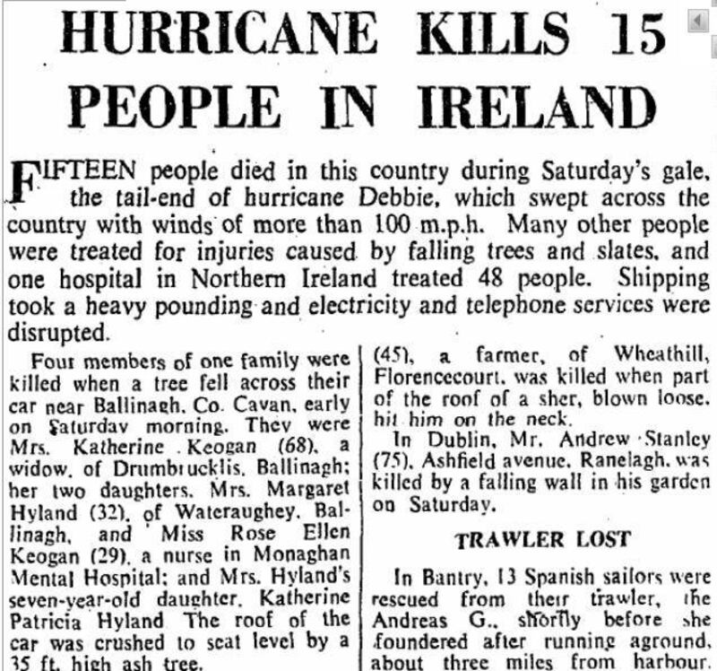 On Monday September 18th, 1961, The Irish Times reported the storm had killed 15 people on the island of Ireland.