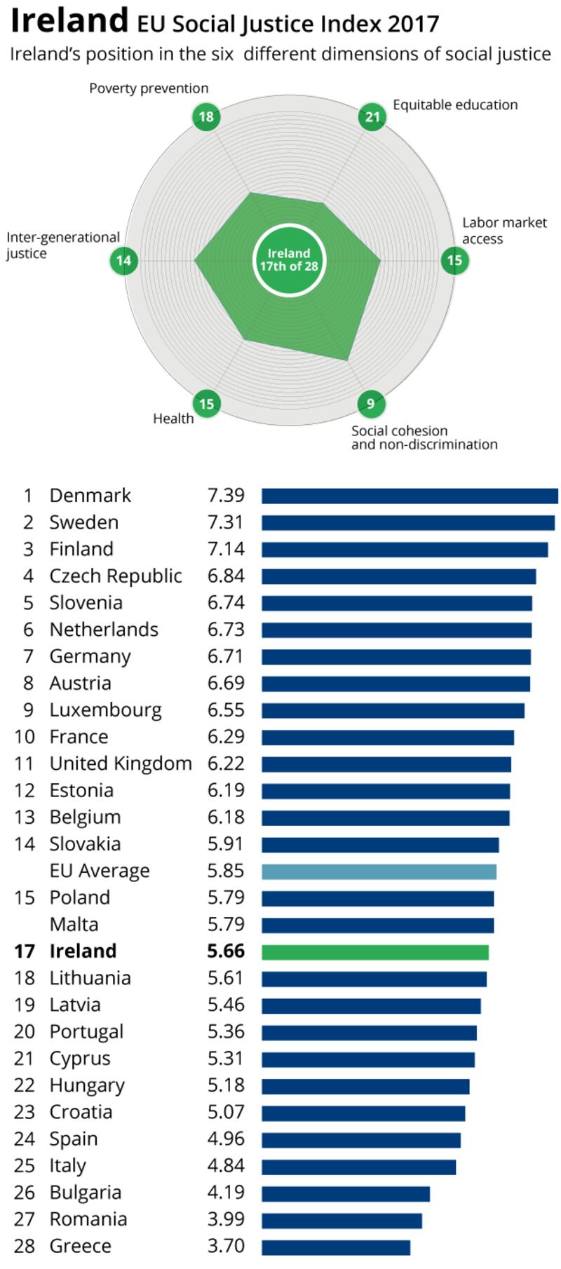 The report by the German Bertelsmann Stiftung, a philanthropic foundation, uses a Social Justice Index (SJI) combining 38 measures of poverty, education, the labour market, health, intergenerational equity, social cohesion and non-discrimination.