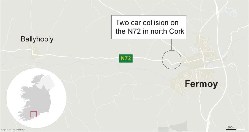 A young man has died and three other people have been injured, one seriously, in a two car collision on the N72 in north Cork.