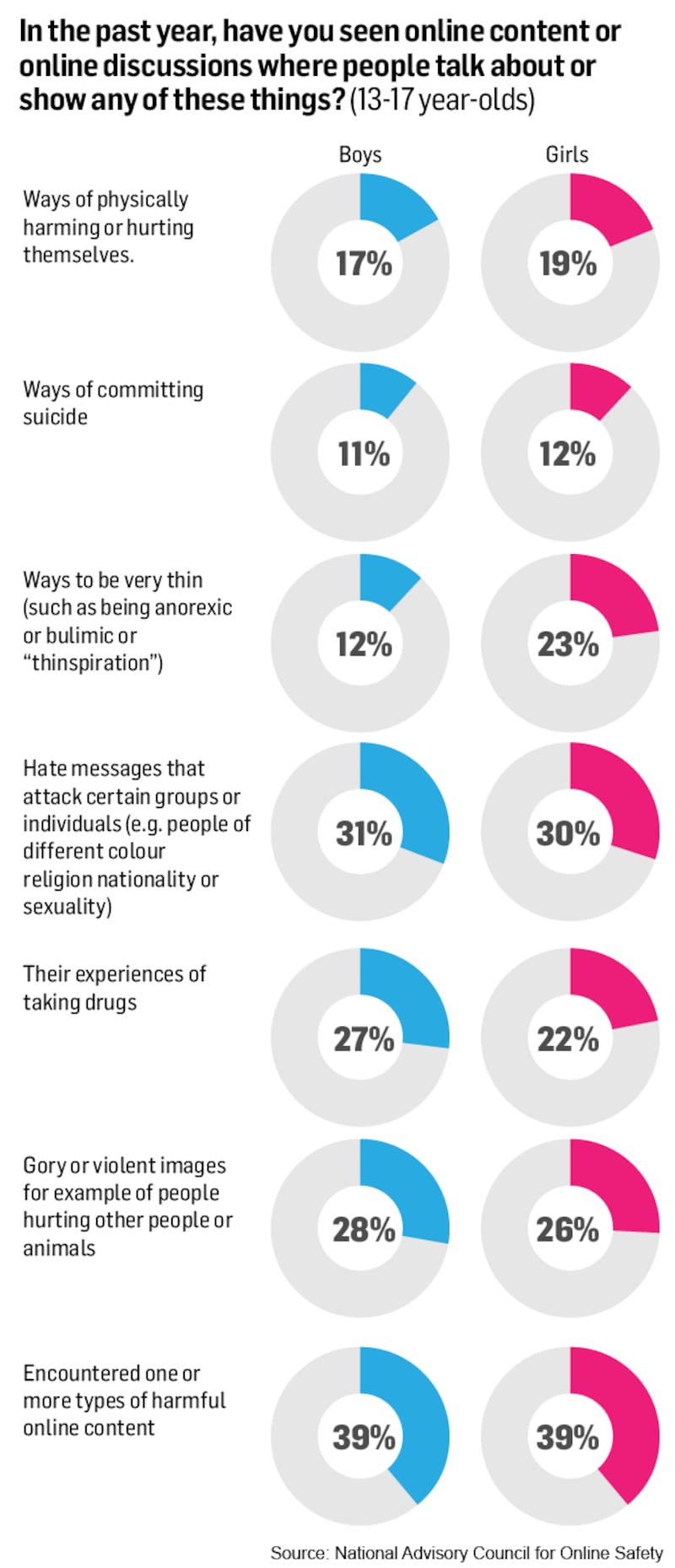 Overall 11 per cent of young people reported coming across content promoting ways to be very thin, while nine per cent had encountered information on ways to die by suicide.