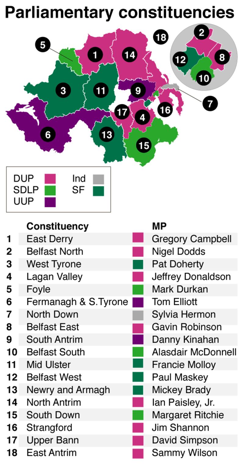 In the 2015 election the DUP won eight of the 18 single-seater constituencies, losing one in South Antrim; Sinn Féin won four, losing Fermanagh-South Tyrone; the Ulster Unionist Party won two – Fermanagh-South Tyrone and South Antrim – a gain of two; the SDLP held its three seats; and independent unionist Sylvia Hermon romped home in North Down.
