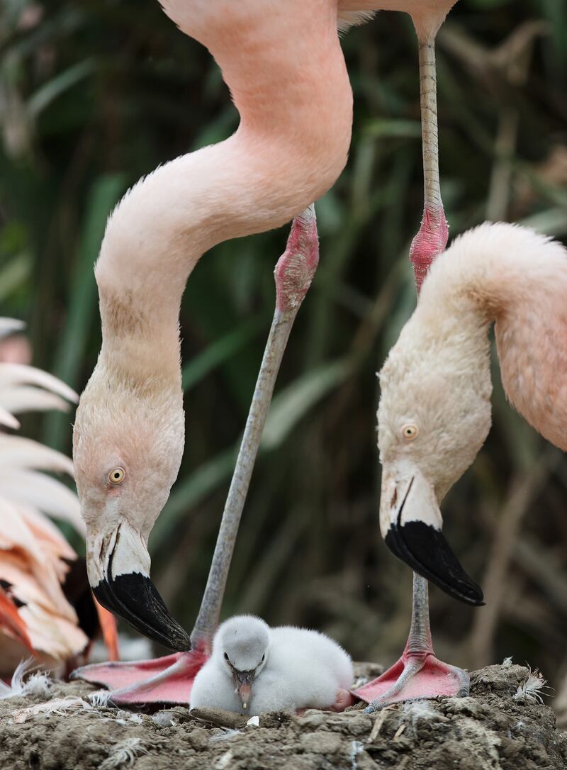 The Chilean flamingo chicks hatched after a 30-day incubation and now join the 86-strong flock at the zoo.