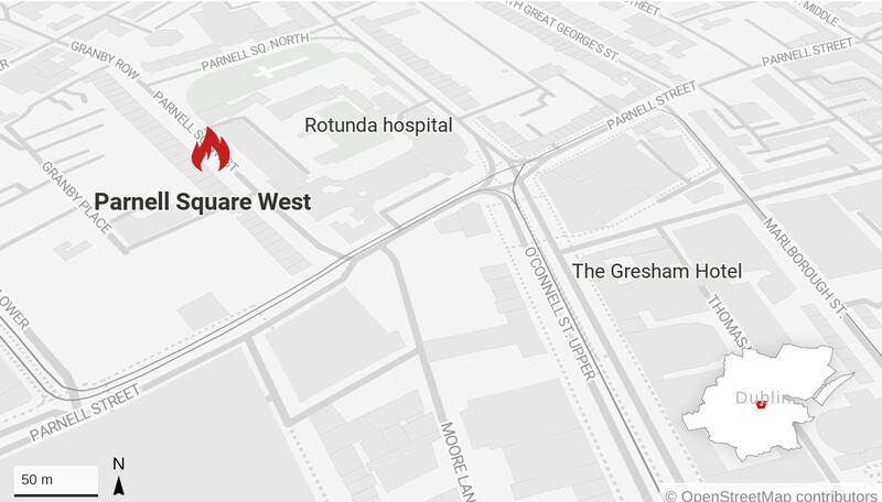 Four fire engines, carrying 17 firefighters, from Phibsborough and Tara Street stations were called to Parnell Square West at about 2am on Thursday after a fire broke out in a building across from the Rotunda hospital in Dublin's city centre.