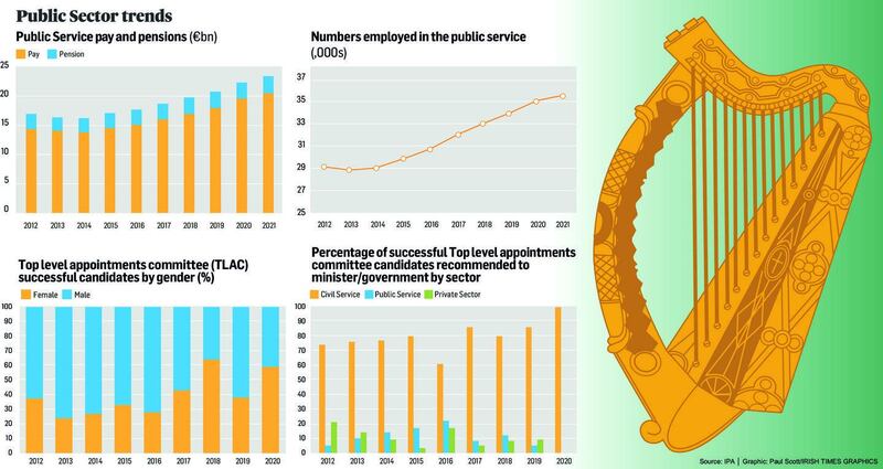 Public service pay and pensions and the number employed rose to new peaks in 2021, but the numbers of women now getting top jobs in the public service has increased substantially in recent years.
