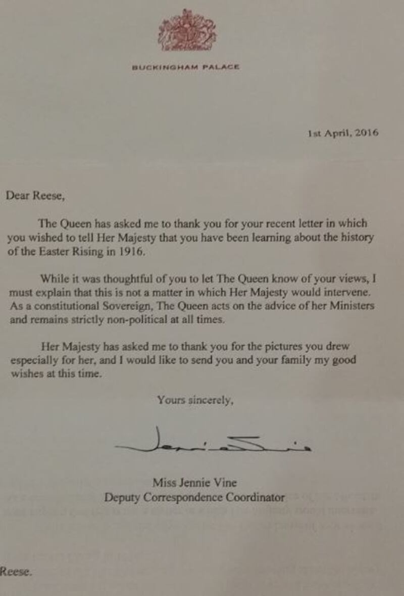 "The Queen has asked me to thank you for your recent letter in which you wished to tell Her Majesty that you have been learning about the history of the Easter Rising 1916, " the letter stated.